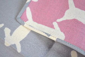 綿100%の素材で、密に織られており、少しだけ光沢がある質感で手触りも良いです(*^-^*) 手捺染で染められたうさぎがポイントに! リバーシブルになっているので、気分に合わせてお使いいただけます♪