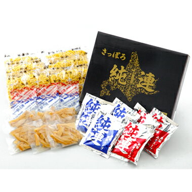 <スープ>濃厚味噌スープ<麺>生・中細・ちぢれ麺 札幌市で絶大な人気を誇る老舗ラーメン店「純連」の味をそのままご家庭でお楽しみください! (※写真は調理例です) 【セット内容】 ・さっぽろ純連みそ味(メンマ付き)×3食 ・さっぽろ純連しょう油味(メンマ付き)×3食 生ラーメン ×6食 味噌味スープ ×3食 味噌味用調味油 ×3食 醤油味スープ ×3食 醤油味用調味油 ×3食 味付メンマ ×6食 しおり ×1枚